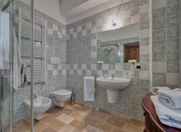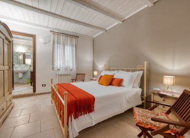 La camera Pascoli è un accogliente camera matrimoniale ed arredata con gusto, dal soffitto rivestito in legno e pavimento in chianche martinesi, bagno con ampia doccia in vetro.