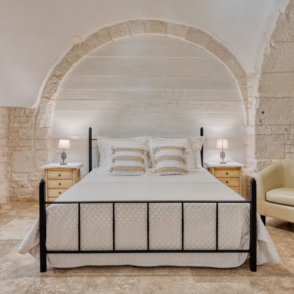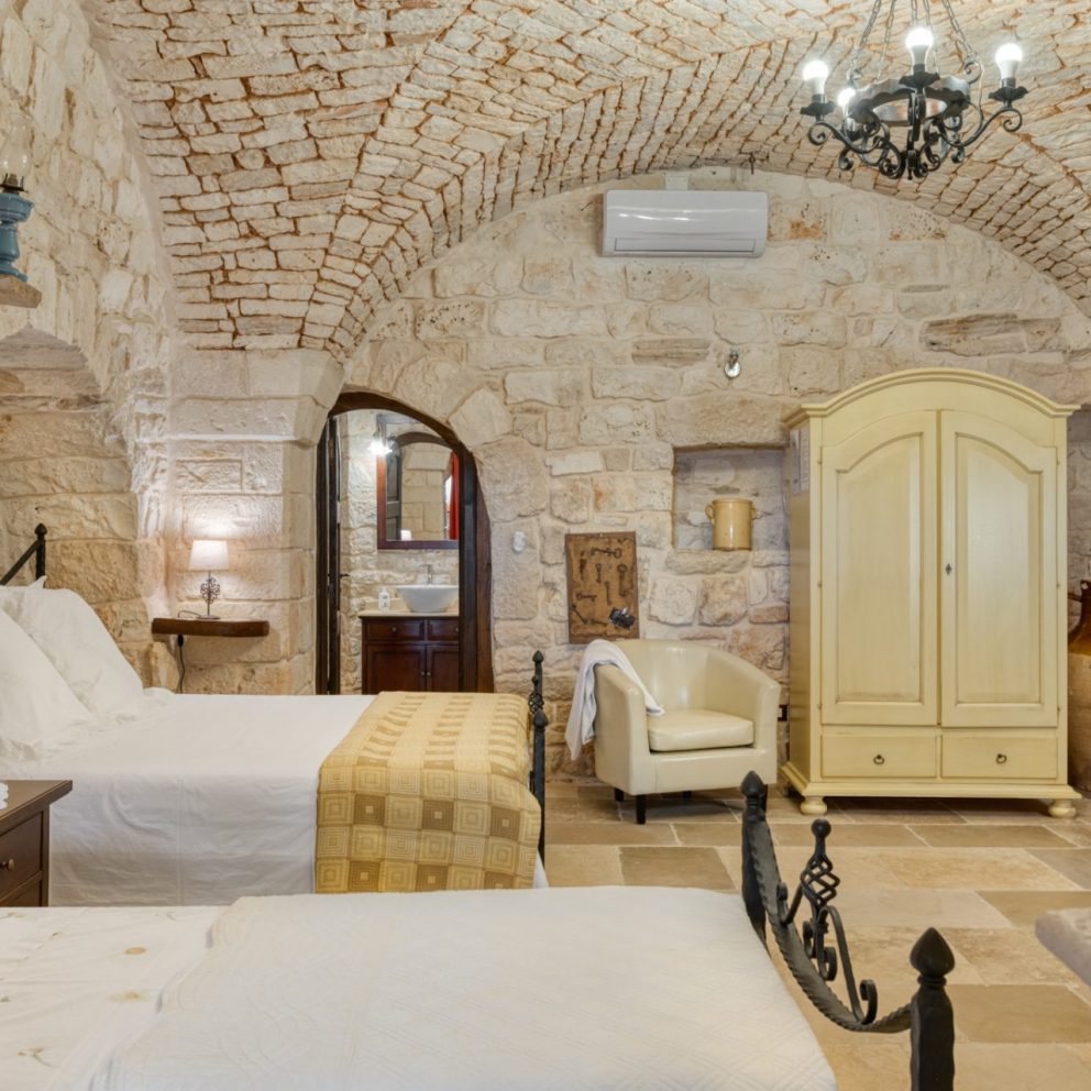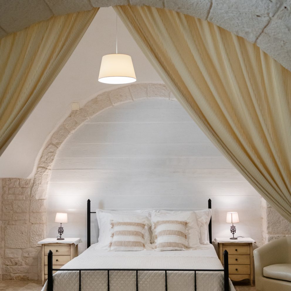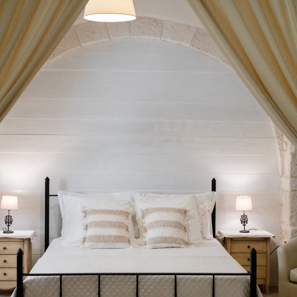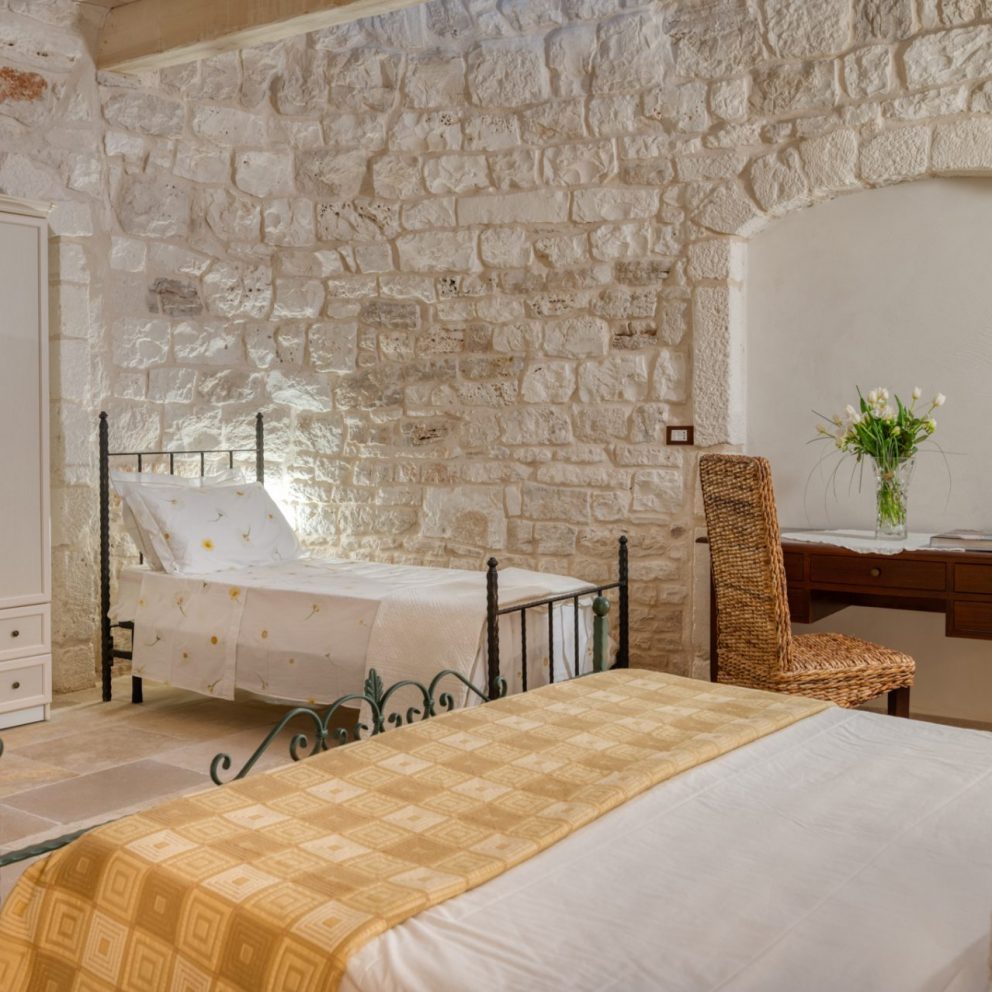 La suite trullo Verga era in origine la stalla della masseria, completamente ristrutturata e portata a pietra viva per non perdere le caratteristiche ereditate, diventando una calda e accogliente camera per tre persone. Grande circa 40 mq, dotata di tutti i comfort e arredata con la cura del dettaglio, è composta da un letto matrimoniale […]